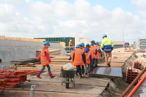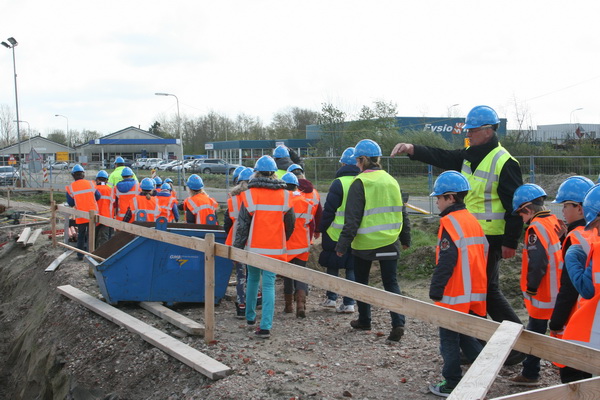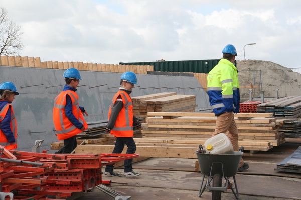 Even verzamelen! Zijn we er allemaal?! Ja, meester Henk ook, en de moeders? GMB’s Janko Haaksema doet alsof ie thuis is, en dat is natuurlijk ook zo, op dit bouwterrein…