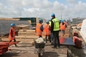 Zo, we komen weer bovengronds. “Let op je helm!” Aanvoerder Janko laveert de groep over de enige vloer waar nog geen vast wegdek ligt, moot 10. Hier is nog meer dan een klus te klaren….