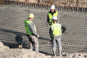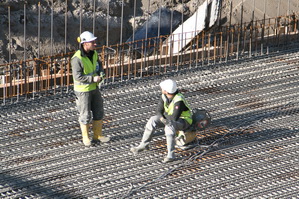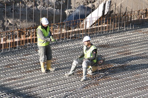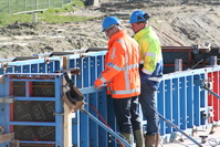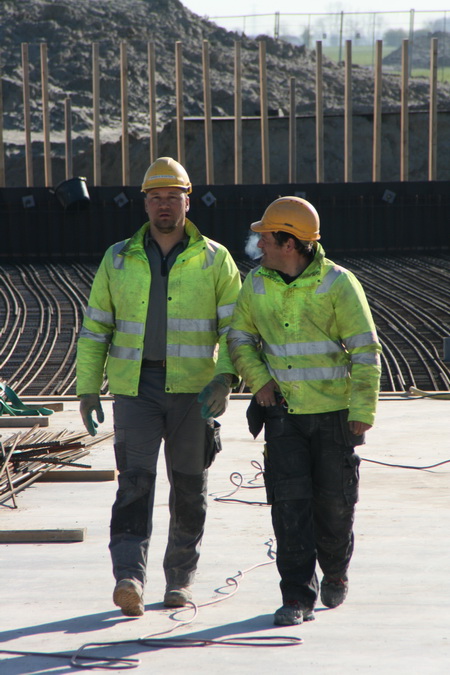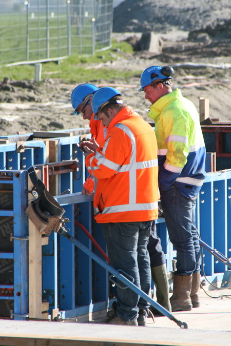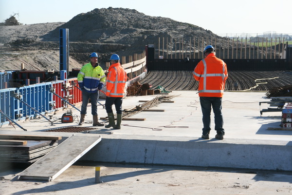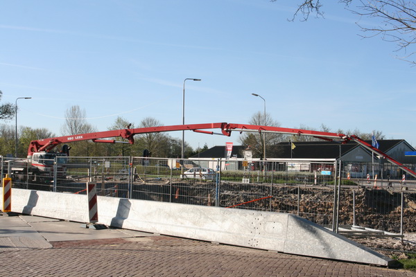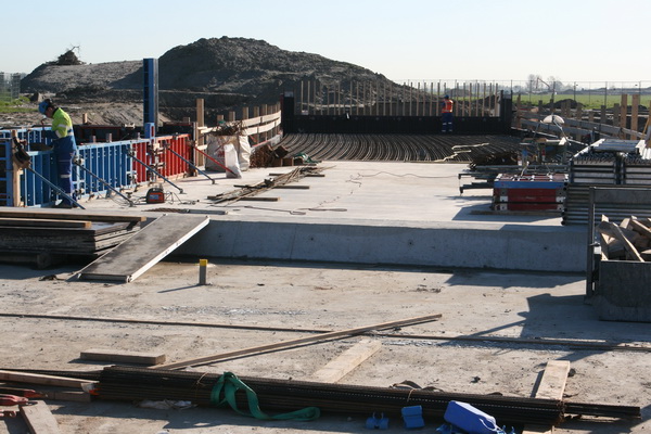 De tunnelmoten aan de oostkant. Links Raymond bij de pompkelder, achteraan bij de scheiding tussen moten 2 en 1 staat René. Het dek van moot 2 ligt er keurig gewapend bij, daar wordt donderdag 17 april beton gestort. Nee, niet met deze NBC-machine, reikt niet ver genoeg. Er is eentje nodig met een bereik van meer dan 50 meter!