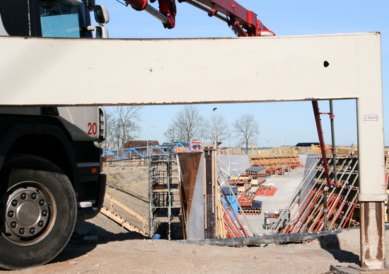Woensdagmorgen 16 april, minder guur dan beide voorgaande dagen, de wind is gedraaid, de temperatuur aangenamer. En een mooie blauwe lucht… Vroegtijdig naar het tunnelgebeuren, de vloer van moot 5 wordt deze dag gestort. De lange arm van de NBC betonpomp (in opdracht van Faber) reikt ver. Maximaal bereik 42 meter… Die informatie krijg ik later van de betonpomper van dienst, die op dat moment zijn knopen staat te tellen. Er is “even” geen beton, de betoncentrales kunnen de aanvragen nauwelijks aan, blijkbaar.