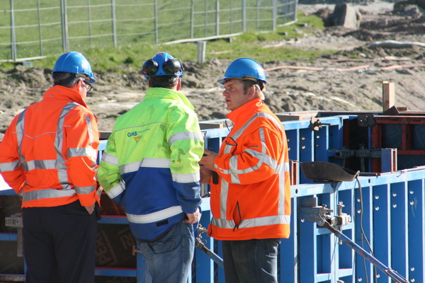 Het is druk vandaag met bezoekers uit het hogere echelon… Assistent-uitvoerder John leidt een bezoeker (met helm, zonder hesje…) naar de tunnelbouw aan de oostkant…