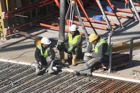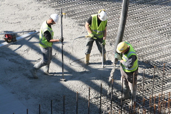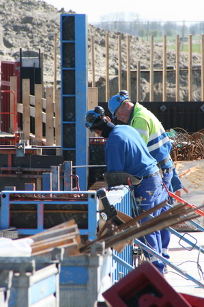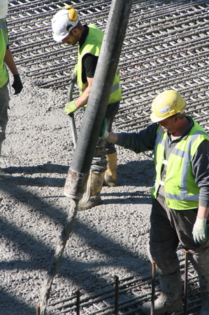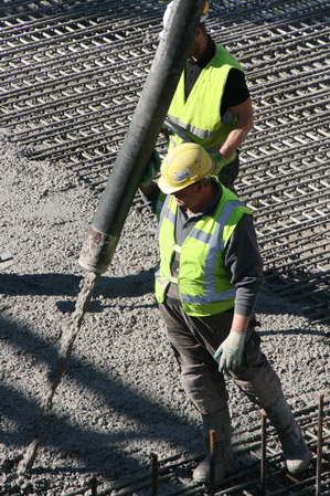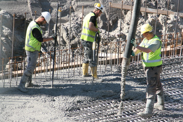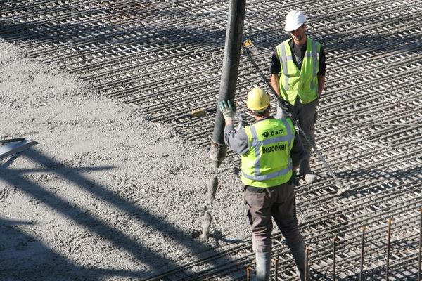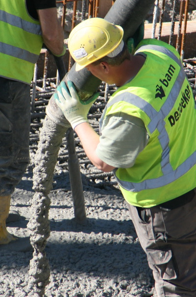 De betonwerkers gaan hun eigen gang: Storten, prikken, stampen, trillen….