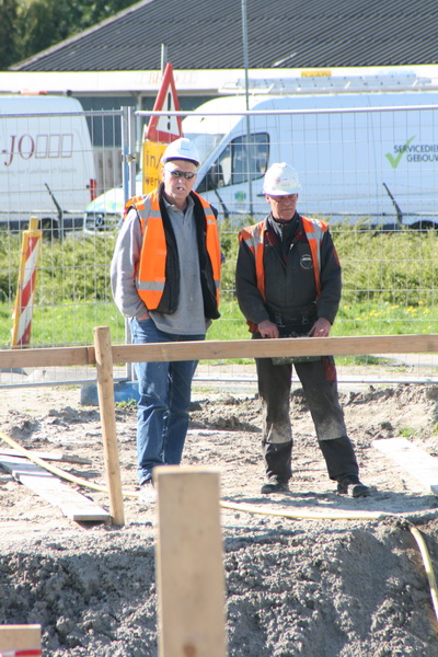 Rechts de bestuurder (met zijn kastje) van de betonpomp van de NBC Leek; links de chauffeur van de betonauto….