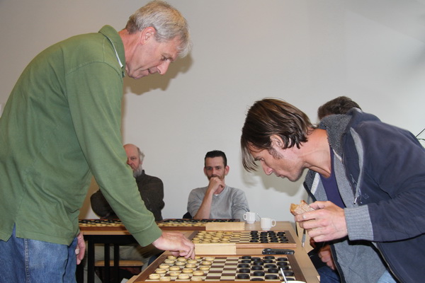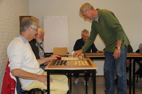 Vol goede moed gaat damkampioen Brouwer langs de deelnemers. Eerst een handdruk, goede gewoonte. Daarna de stenenstrijd op de borden. Proberen acht partijen tegelijkertijd te spelen, dat verdient bewondering!