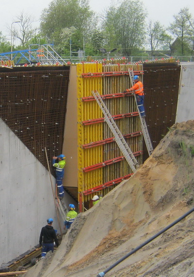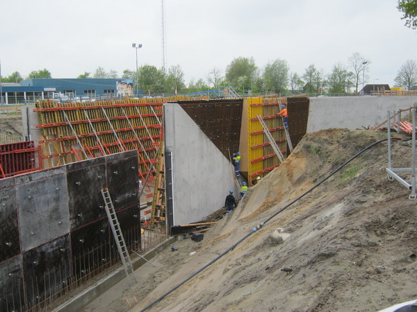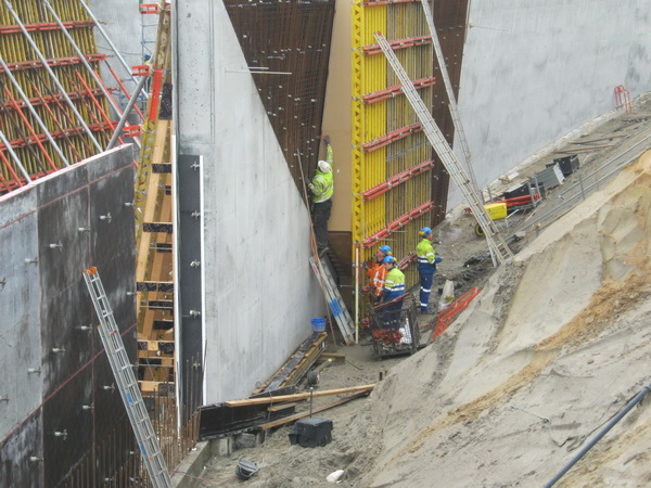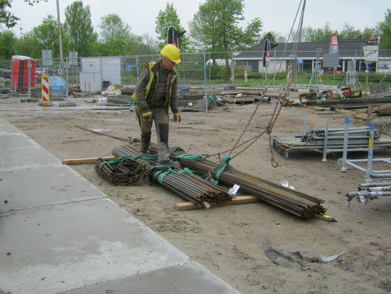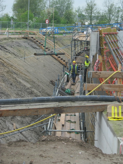 De timmerman op het dek van moot 3 te midden van… Ja, te midden van wat niet allemaal…. In ieder geval heeft het ook hier geregend…. Achteraan het opstaande muurtje dat afgelopen woensdag 30 april zijn beton ‘ontving’ per kubel, via de hijskraan. Het muurtje op de grens van moot 1 en moot 2 komt ruim een meter uit boven het maaiveld. Nee, er komt niets bovenop, geen hekwerk of zo…. Uitzicht vrij.