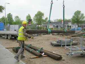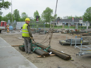 Een van de oudere staaldraadvlechters die hier een bundel klaar maakt voor transport per hijskraan naar de vlechters bij de zuidwestwand van moot 5…