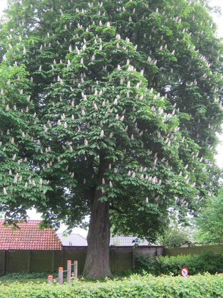 Naar huis! Langs het mooiste ‘natuurlijke’ monument dat Noordhorn rijk is: De oude paardenkastanje bij het speelveldje op de hoek van Oosterweg en Moeshorn. Rijk voorzien van bloei! De boom is zo langzamerhand zo’n twee eeuwen oud…. (In het boek “Gisteren voor de lens” uitgegeven in november 1983, werd de leeftijd van de kastanje geschat op “minstens 150 jaar oud”…)