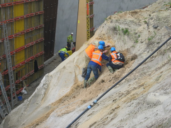 Vele activiteiten in één oogopslag! Op de voorgrond links de staaldraadvlechters bij de wapening van moot 5; achteraan de bekisters nog immer met die lastige moot 6 in de weer; rechts een groep gasten in oranje hesjes en blauwe helmen, met spade. Dit groepje bestaat blijkbaar uit backvocals, op de helling (buiten beeld) de drie hoofdrolspelers…