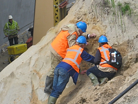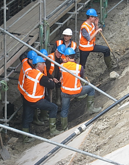 Nu was er volop activiteit in en bij de tunnelbouwput. Bekisters en vlechters, andere timmerbezigheden, wederom een club(je) grondlagenonderzoekers (geologen? archeologen?) of biologisch onderlegden (plantje? diertje?) op de noordoostelijke zandkant bezig met observaties, spade als handgereedschap. Dat was vanmorgen…