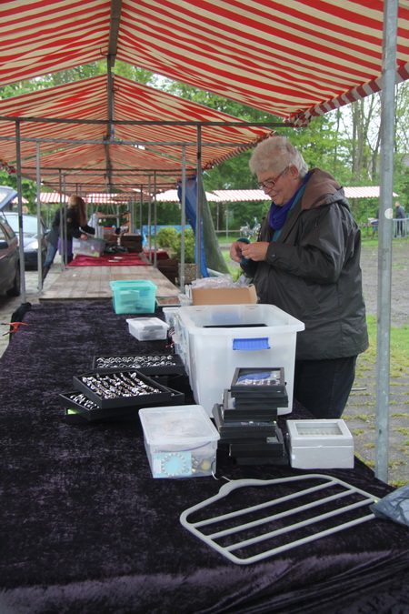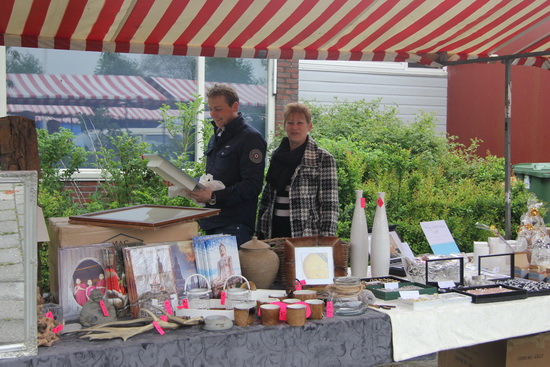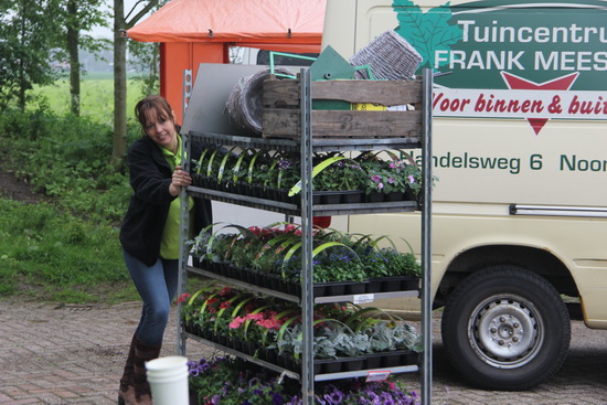 Niet alleen standhouders uit de wijde omgeving, ook plaatselijke ondernemers laten zich zien! Renate Meester duwt een kar met bloeiende planten naar de juiste plek! Ze staat haar mannetje! “Wil je dit even vasthouden??! Bedankt!”