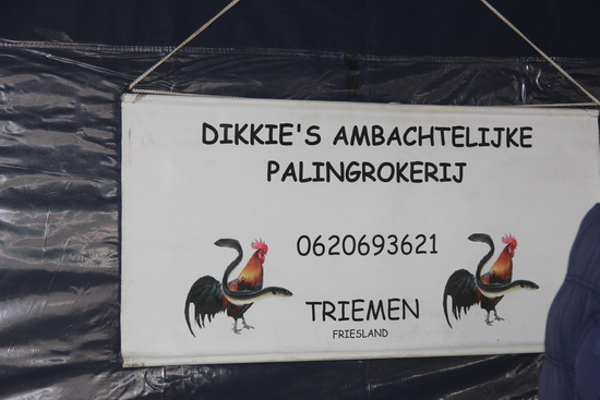 De palingverkopers uit Friesland werken gestaag door aan de inrichting van hun stand. Rustig blijven, niks overhaasten….