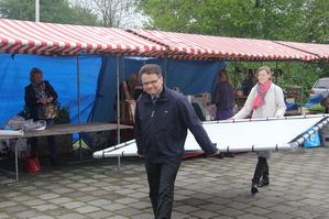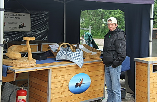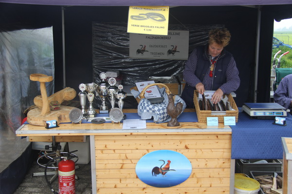 Kijk eens, de kraam van Dikkie is zo goed als klaar! Prachtige bekers, maar, belangrijker, prachtige palingen!