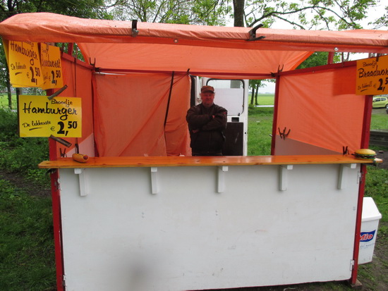 De verrassing van de middag! Tweewielerbaas Klaas omgeschoold tot hamburgerbakker?! (Nee, alleen even op de ‘tent’ passen…)