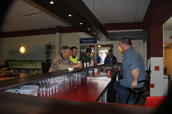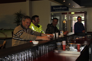 Het bargebied van het dorpshuis De Dörpsstee, het domein deze keer van Wilt de Boer, met aan de publiekszijde: Johan Vermuë, Herman Helmus, Rob Schuur en Kees Schutte. Rob en Kees zijn Dorpsbelangeninsiders, Herman verkeersregelaar, en Johan??! Agrariër uit Kommerzijl die een ‘broederdienst’ kwam bewijzen, op verzoek van zijn broer(tje) Nico die verhinderd was. En nee, Johan kwam niet ‘helemaal uit Kommerzijl’ om de Noordhorner koffie op te drinken! Een fikse rijplatenklus, en heel kort aan de bar, ter bekroning! (Heb ik het zo goed gezegd, Johan??!)