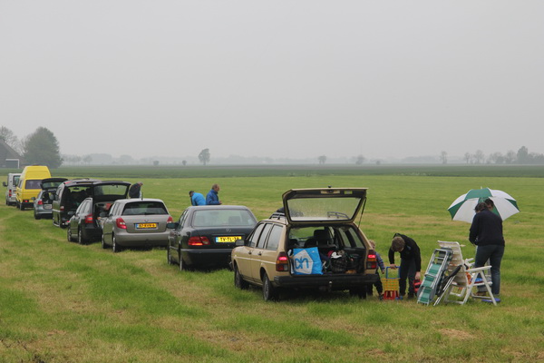 De grondsituatie van de Noordhorner vliegerwereld tijdens de jaarmarkt. Keurig in lijn op het land van Den Besten…