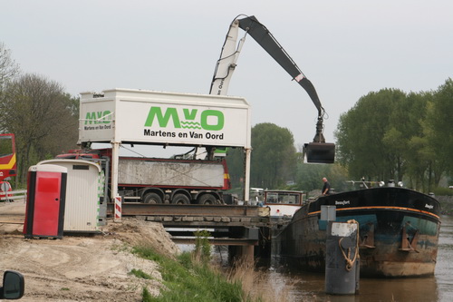 Hier ligt de “Beaufort” aan de tijdelijke kade van Martens en Van Oord, voor de aanvoer van baggergrond voor het tracé van de nieuwe N355.