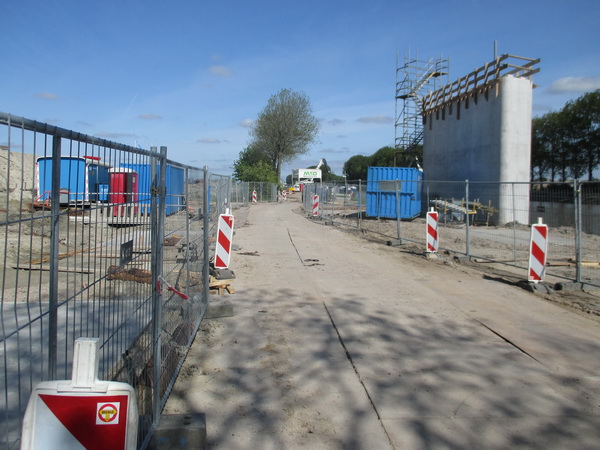 De zuidelijke pijler met verder naar achteren, en hoger, de landhoofden in aanbouw. Dat is toch nog even doorpakken om de boel tijdig klaar te hebben voor de Grote Liggerlegshow…. (Op 22, 23 en vooral 24 mei a.s.)