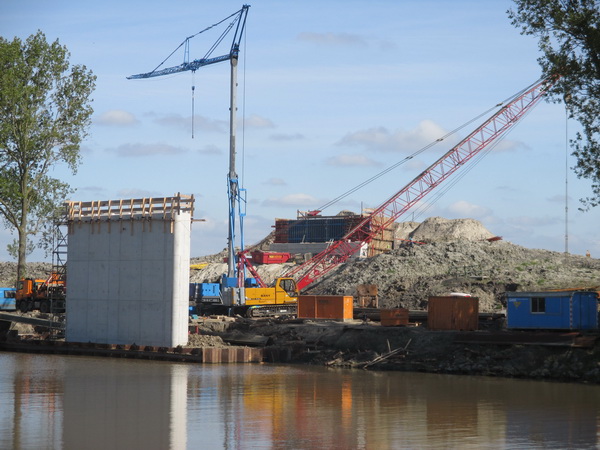 Vanmiddag vooral foto’s gemaakt met de grote Canon (die komen op de andere weblog: http://www.bloeiendonkruid.com). Toch ook een paar met de lutje Canon, de Ixus 150. Zoals deze, bij de noordelijke pijler. Links en rechts zijn platformen zichtbaar waarop de telescoopkranen worden geplaatst die eind volgende week de liggers op hun plek moeten tillen.