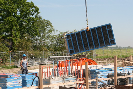 Nee, geen vliegende schotel, verzeild in Noordhorn… Een bekistingselement wordt richting stapel gedirigeerd, een voorlopige verblijfplaats. Het wachten is daarna op de vrachtwagen voor de afvoer naar een volgend project, of voor een plaats in het magazijn…
