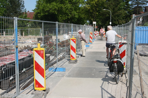 En altijd is er wel publieke belangstelling voor het tunnelwerk! Links oud-stationschef De Groot uit Zuidhorn, rechts Noordhorner Klaas Veenstra, op de terreinfiets. Training achter de rug? Voor wandelaars en fietsers blijft er een smal doorkomen aan…