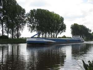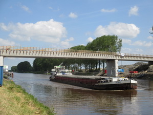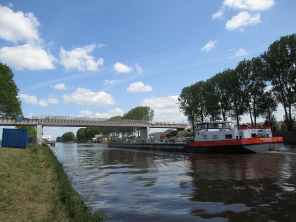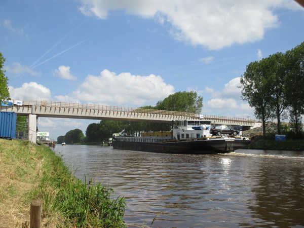 Net als ik nader op de Batavus, passeert de Synthese-2 de NVH-brug. Een grote, zo te zien vrij nieuwe binnenvaarder… (Nee, de gegevens kon ik niet meer lezen..)