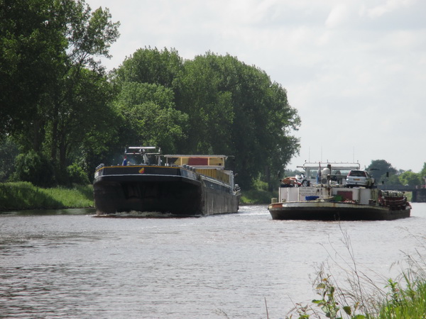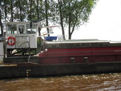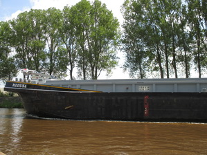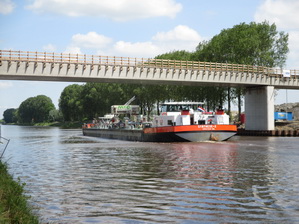 Ik ben al weer aan de westkant van de brug, in de buurt van de rode loper, als deze binnenvaarder passeert. Minder groot, ouder….