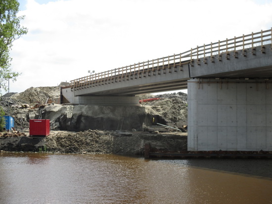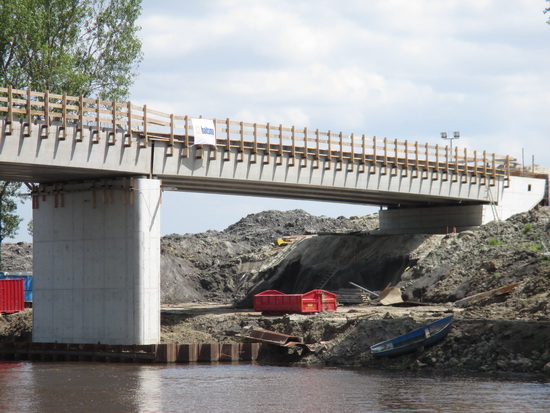 Het zuidelijke deel van de NVH-brug van pijler tot landhoofden. De pijler is ruim 9 meter hoog. Ja, ik ben er twee keer bovenop geweest, in de aanbouwfase…. En nee, ik heb de meeste van de foto’s die ik toen maakte, (nog) niet gepubliceerd….. De lengte van de korte liggers (4 in getal)? Volgens GMB-informatie, in de buurt van de 40 meter….