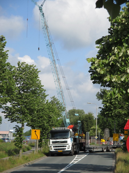 Vanmorgen op de heenreis naar het ‘bloedprikken’ in het Zuidhorner Cultuurcentrum zag ik in de Langestraat (midden) al dat de Zwagermankraan van Louis fier overeind stond. Mag ie nog even blijven? Bekistingen tillen? (Net vernomen: Kraan nummer 2 wordt komende woensdag 4 juni gedemonteerd en weggebracht)
