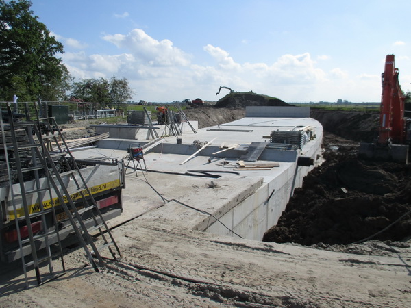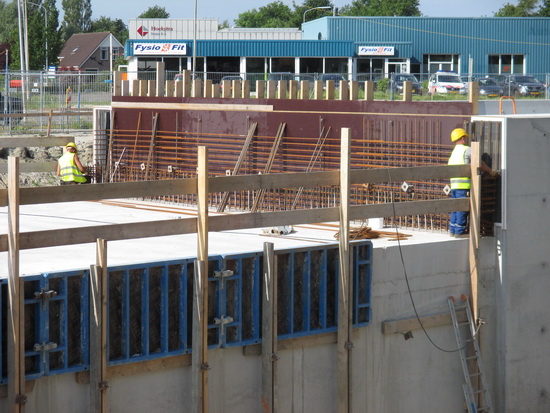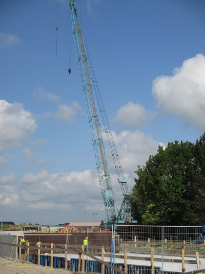 Vanaf de ‘noodweg’, de hijskraan. Aan het eind van moot 5 zijn twee staaldraadvlechters bezig met de wapening van het muurtje dat daar komt, ter afscheiding. Markeert het einde van het bedekte deel, en het begin van het open gedeelte.