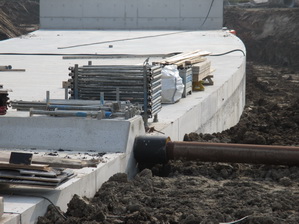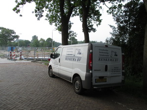 Rechts de vrachtwagen van een gespecialiseerd bedrijf dat bij de pompkelder actief is… Plaatsing pompen?! Of plaatst dit bedrijf ‘slechts’ de toegangsdeksels op het dak van de pompkelder?! De man op het dak heeft gedeelten van buizen onder de arm….