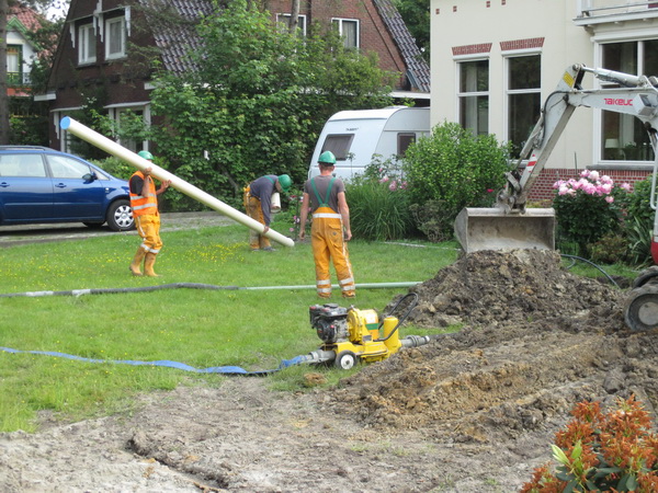 Er zijn werknemers van grondbedrijf Renkema actief (bij het afgraven van de bult?), maar rechts in de tuin van de Kruizinga’s zijn het denk ik mensen van Hak die met de leidingen bezig zijn…