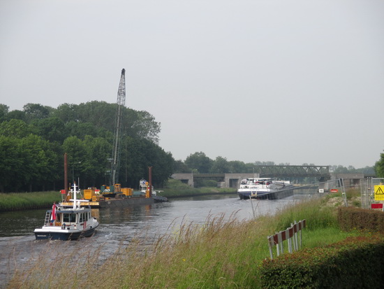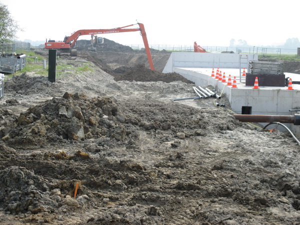 Topdrukte wat graven betreft… De open ruimtes tussen tunnel en omgeving worden gevuld. De grote bult op de achtergrond wordt kleiner, daar komt ruimte voor het tracé van de verlegde N355. En veehouder Holtman kan ook nog grond van de bult gebruiken voor het verbeteren van stukken land bij zijn bedrijf…