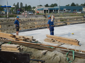 Betontimmerman Alje (met planken) en zijn GMB-kompaan (vervelend dat ik niet alle namen in één keer kan onthouden, dat was vroeger wel anders…) bezig op het dek van moot 5. Daar komt een afscheidingsmuur(tje), moet worden bekist. Vrijdag 6 juni (Morgen dus) wordt er beton gestort.