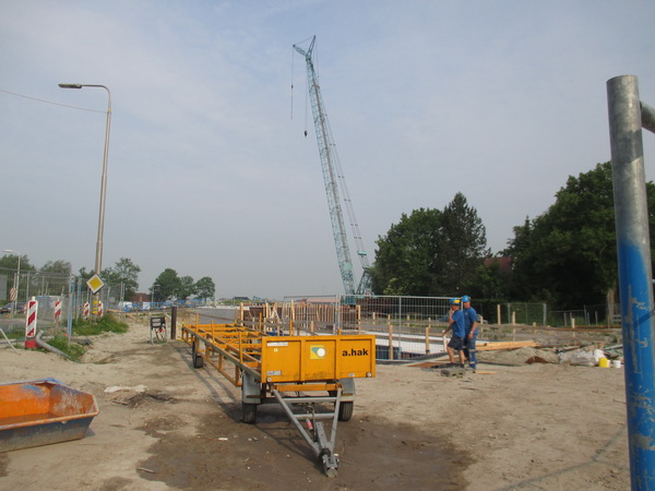A.Hak is nadrukkelijk aanwezig, met de lege buizenaanhanger. De Zwagermankraan staat hier nog fier overeind, maar is gisteravond alsnog ingepakt en weggebracht. Alje en zijn timmermaat gaan kijken hoe de koffie smaakt….