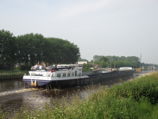 De “Aurora” vaart westwaarts richting spoorbrug en verder naar de sluis bij Gaarkeuken. Een van de grotere binnenvaarders: