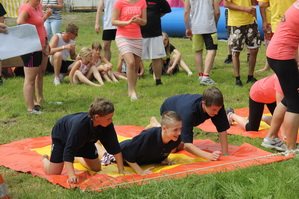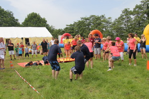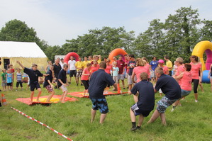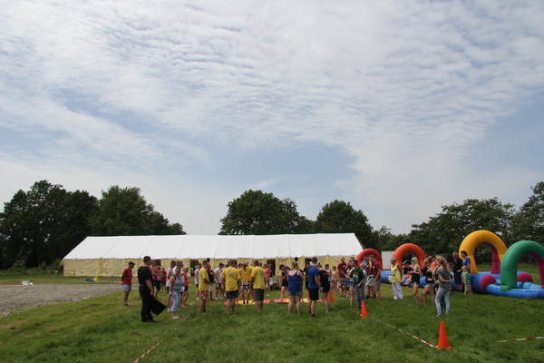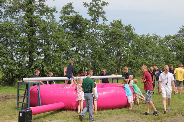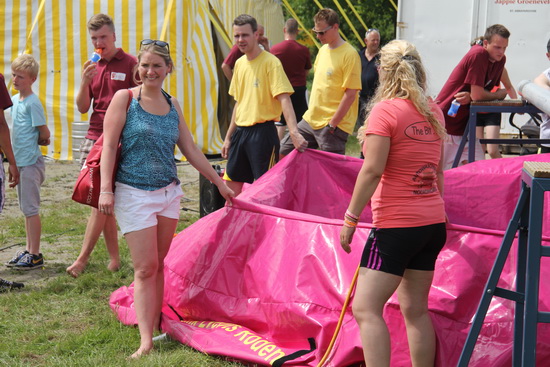 Het bad is weer opgeblazen, nu het water nog…. Ja, met een tuinslang duurt het nog uren…. Het wachten voor dit onderdeel is op de tankwagen van Burgler. Maar er zijn nog meer wedstrijdonderdelen af te werken!