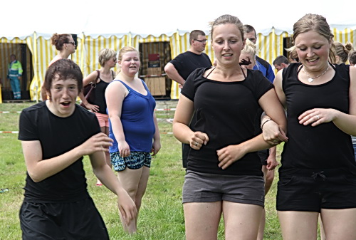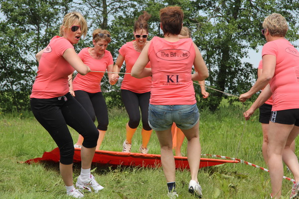 Dat valt tegen! Dan maar niet liggen, staan!! En springen! De deelnemers zijn vlug van begrip, de finish wordt gehaald.