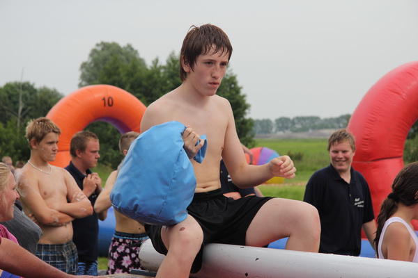 Het laatste onderdeel: Het kussengevecht op de gladde paal boven het zwembad… Sven (van Bo Bo Sch) is er helemaal klaar voor, hij concentreert zich, of bezweert hij de boze geesten? In ieder geval: Kom maar op!
