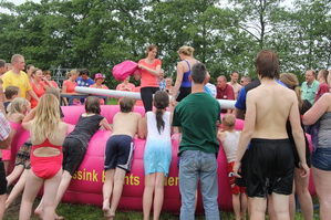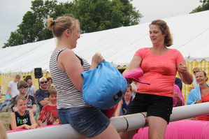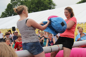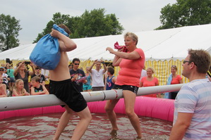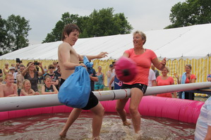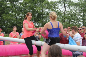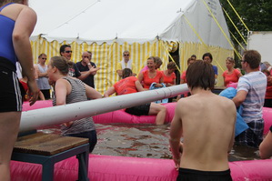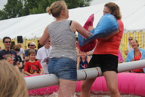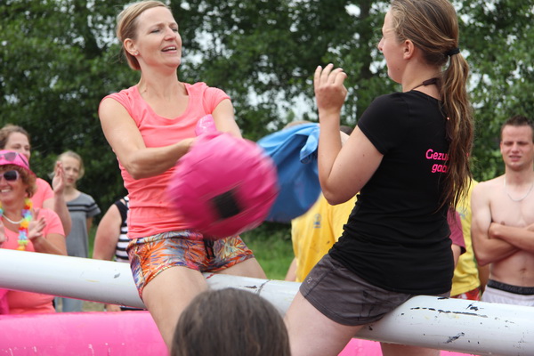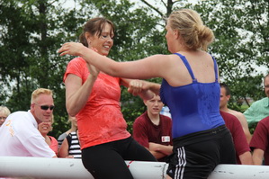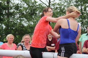 Renate (Bit..es) en Manon (Bo Bo Sch), beiden houden zich uitstekend zittende op de gladde mast! Spelleider Mark verordonneert dan het gevecht maar voort te zetten met blote handen, zonder kussen…