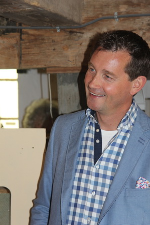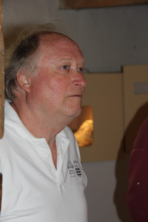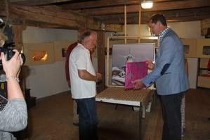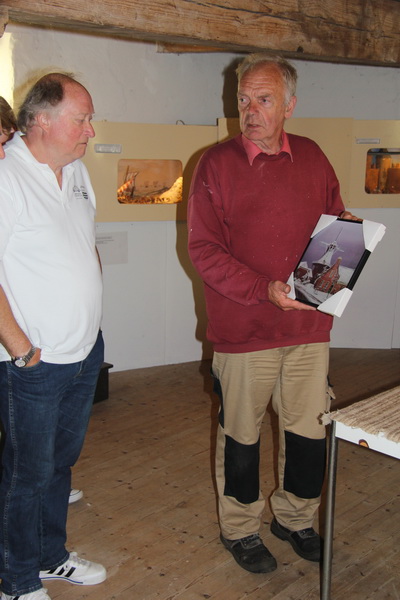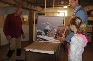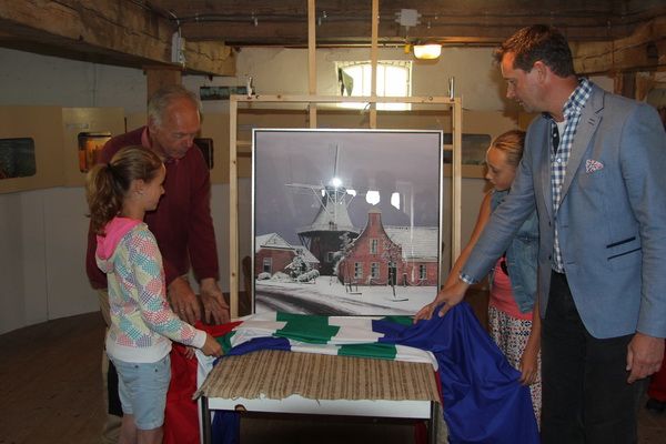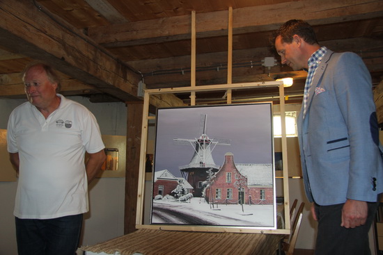Sprekende molenaar Klaas Hekker vertelt nog even dat de reproducties en de kaarten met enveloppen te koop zijn in de molen. Samenwerkingsverband tussen kunstenaar en molencommissie….