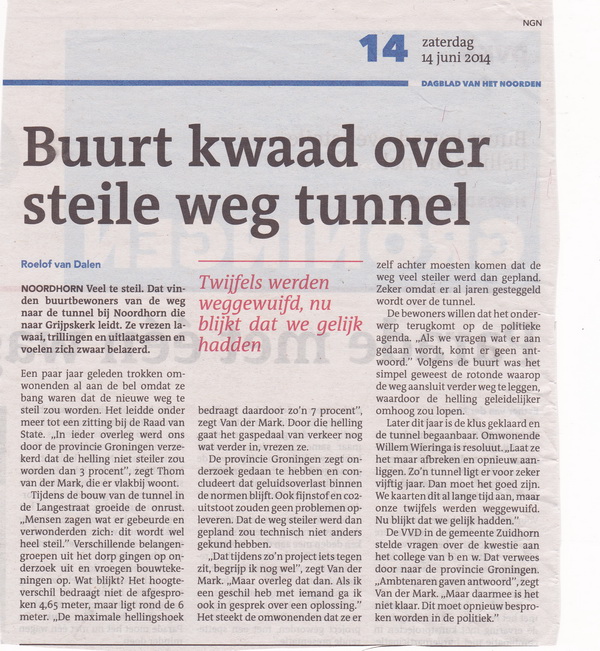 Door collega-blogger Jan Thijs de Haan op het spoor gezet van een artikel in het Dagblad van het Noorden van afgelopen zaterdag 14 juni 2014. (Nee, we hebben geen abonnement op deze krant en na het lezen van de bijdrage van Roelof van Dalen is de behoefte om abonnee te worden bepaald niet gegroeid…) “Buurt kwaad over steile weg tunnel”…. Of de buurt echt kwaad is, wordt in het artikel niet aangetoond. Te gemakkelijke journalistiek? Nou ja… Thom van der Mark woont in ieder geval niet vlakbij de helling van tunnel naar rotonde en Willem Wieringa, zoals bekend verondersteld, aan de andere kant van het tunnelgebied…. En buurtbewoners die wel vlakbij de rotonde of bij de steile helling wonen? Standpunten van de Provincie Groningen, of van de Gemeente Zuidhorn, of van aannemer GMB? Niét in het artikel… De balans is zoek. Benieuwd of het onderwerp op de politieke agenda komt…