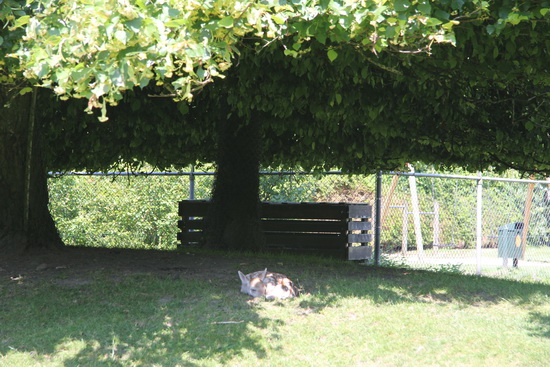 Vanmiddag tegen een uur of één.. Het eerste jonge hertje (eerste kan hier nog weg, want er was nog geen tweede…) had de oncomfortabele, kale plek bij de afvalbak al lang verruild voor een betere: Boven op de berg, onder de lindes, halfschaduw.