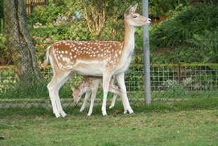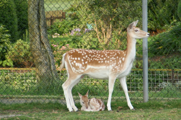 In het andere deel van de hertenkamp is het eerste jonge hertje een en al leven! Onder de hoede van de hinde en extra beschermd door grote zus….
