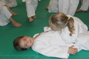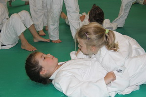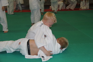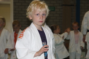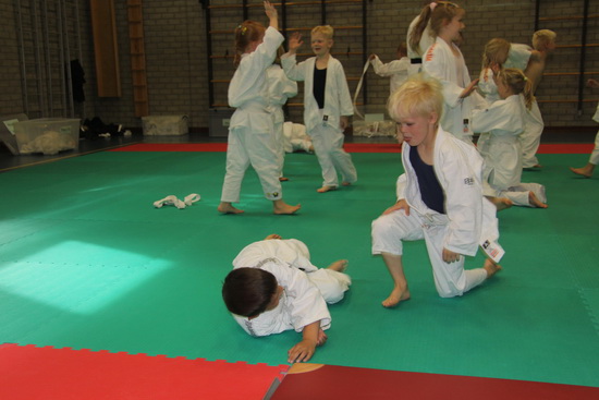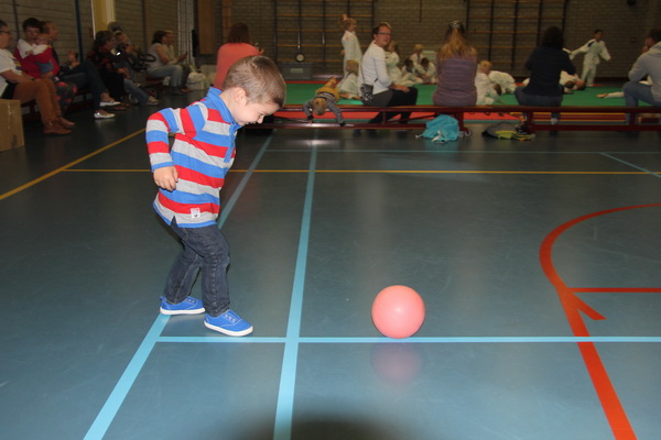 Als ik stilletjes binnen kom, is de les voor deze jongere kinderen in volle gang. De helft van de gymzaal is belegd met judomatten, rondom banken voor de kijkende ouders en jonge aanwas (van wie sommigen in de lege helft van de zaal met juf Irene een balletje gingen trappen. Invloed WK?)