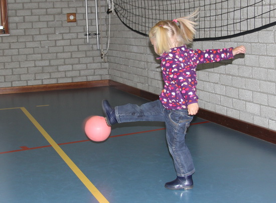 Dit jongetje doet opgetogen mee aan het “balletje trappen” samen met juf Irene. Voor ik ook maar iets zou kunnen zeggen, heeft ie mij al met de vinger op de lippen tot stilte gemaand…..
