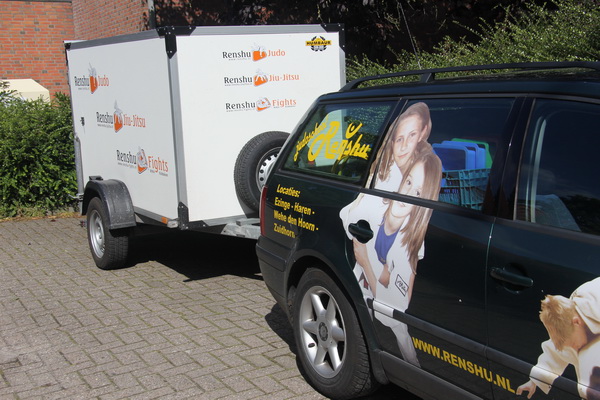 Al verschillende keren had ik deze auto met aanhanger bij het sportgebouw zien staan. Nu weet ik waarom: Gezamenlijke judolessen van beide afzonderlijke scholen, die ene gewenste samenwerkingsschool funderend!