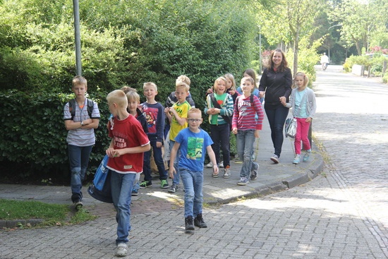 Een groep, een juf… Op weg van school naar het gymgebouw voor de gezamenlijke, afsluitende judoles. De stemming lijkt zo te zien prima!