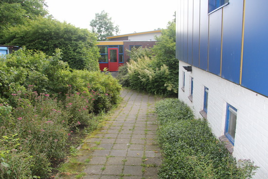 Het pad langs ‘het hoofdenkamertje’ naar de onderbouw (het vroegere handenarbeidlokaal dat uitgroeide tot een zelfstandige kleuterschool, voordat de OBS ontstond…). Links is nog een stukje van de oud-papiercontainer te zien. Vroeger werd het niveauverschil overbrugd met stenen trappetjes, later werd de hellingbaan aangelegd.
