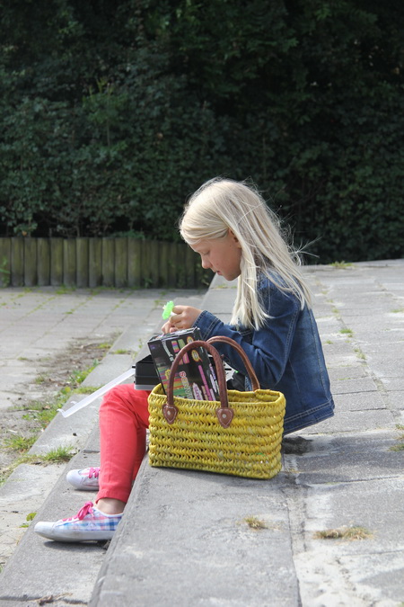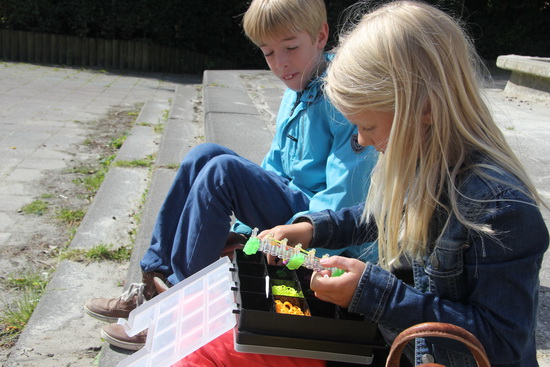 Wil je het goed doen, dan moet je beslagen ten ijs komen en loommateriaal meenemen. Gekleurde elastiekjes, een loombord, etc. De kinderen zitten op de rand van het hoge plein. De overgang naar het grote plein verloopt via stoeptreden. Vroeger stond er een steil muurtje, zelfs een keer helemaal opnieuw gemetseld…..