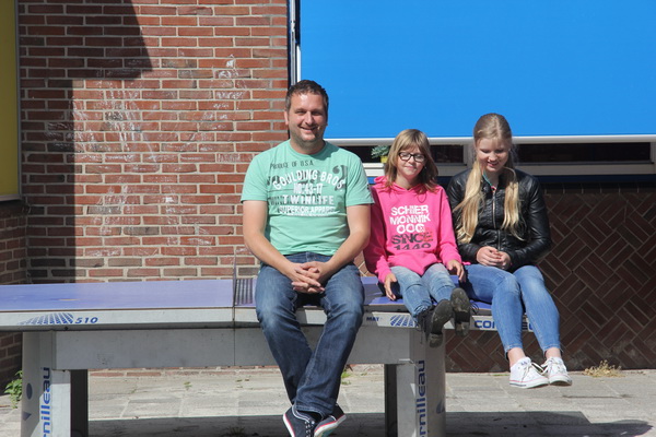 Meester Bas samen met twee meisjes uit de bovenbouw. Meester Bas gaat mee naar de samenwerkingsschool. Zitten op een tafeltennistafel???! Ja, deze kan het hebben, een stenen exemplaar. In de hal van de school hebben we vele jaren een tafeltennistafel gehad. De tafeltennisvereniging “Hoos 74” (helaas al lang weer ter ziele…) startte hier in de school, voordat er ruimte kwam in het sportgebouw aan de Westergast (toen de gymclub “De Vogels” werd opgeheven…) En op deze plek bij de school, buiten? Gras, en meer naar rechts hebben we een tijd lang tuintjes gehad, en eerder zelfs schooldieren zoals kippen en konijnen….